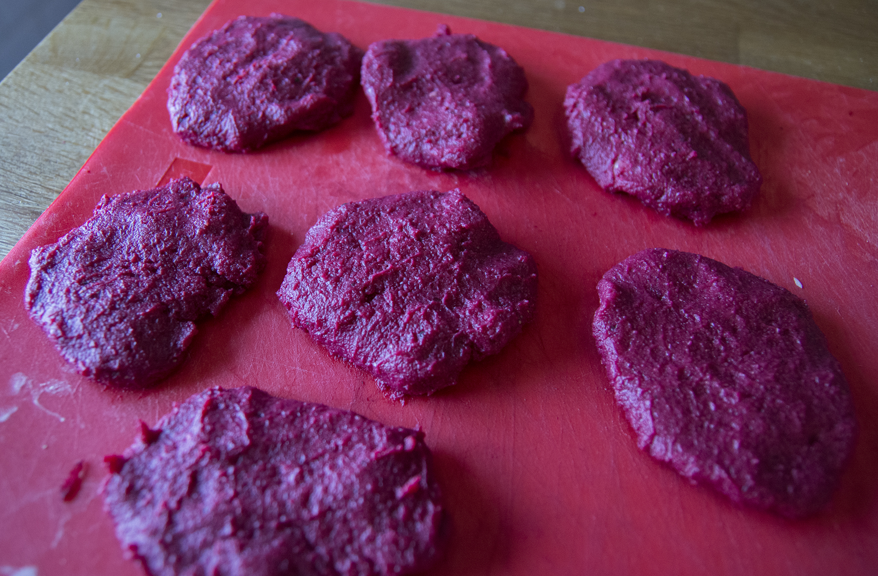 Fortsätt med biffarna. Häll kikärtorna i en sil, skölj och låt rinna av. Grovriv rödbetorna. Mixa med stavmixer eller i matberedare tills det blir en slät smet. Blanda i salt och svartpeppar. Forma till biffar och stek i olja tills de fått en fin yta.