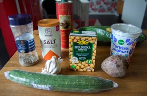 Börja med tzatzikin. Riv gurkan grovt och blanda med salt i en sil. Låt rinna av i 10-15 minuter. Krama ur all överflödig vätska. Blanda med yoghurt, olivolja, svartpeppar och pressas vitlök. Låt stå i kylen.