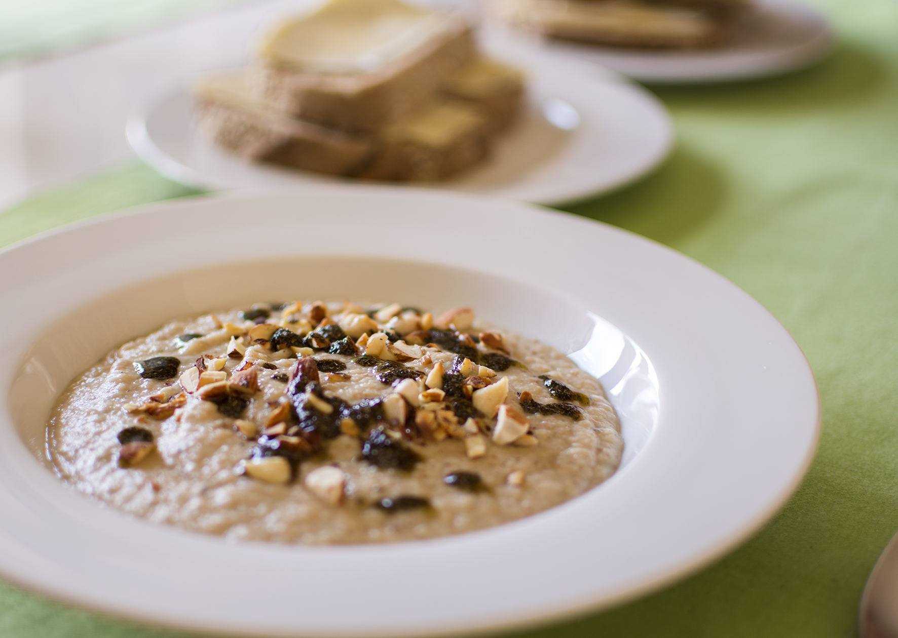 Häll upp soppan i tallrikar och toppa med resten av mandeln. Sprinkla över örtoljan. Servera med ett gott bröd.