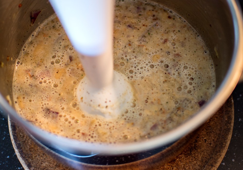 Mixa soppan tills den blir krämig och slät. Tillsätt parmesanosten, rör om och smaka av med salt och svartpeppar.