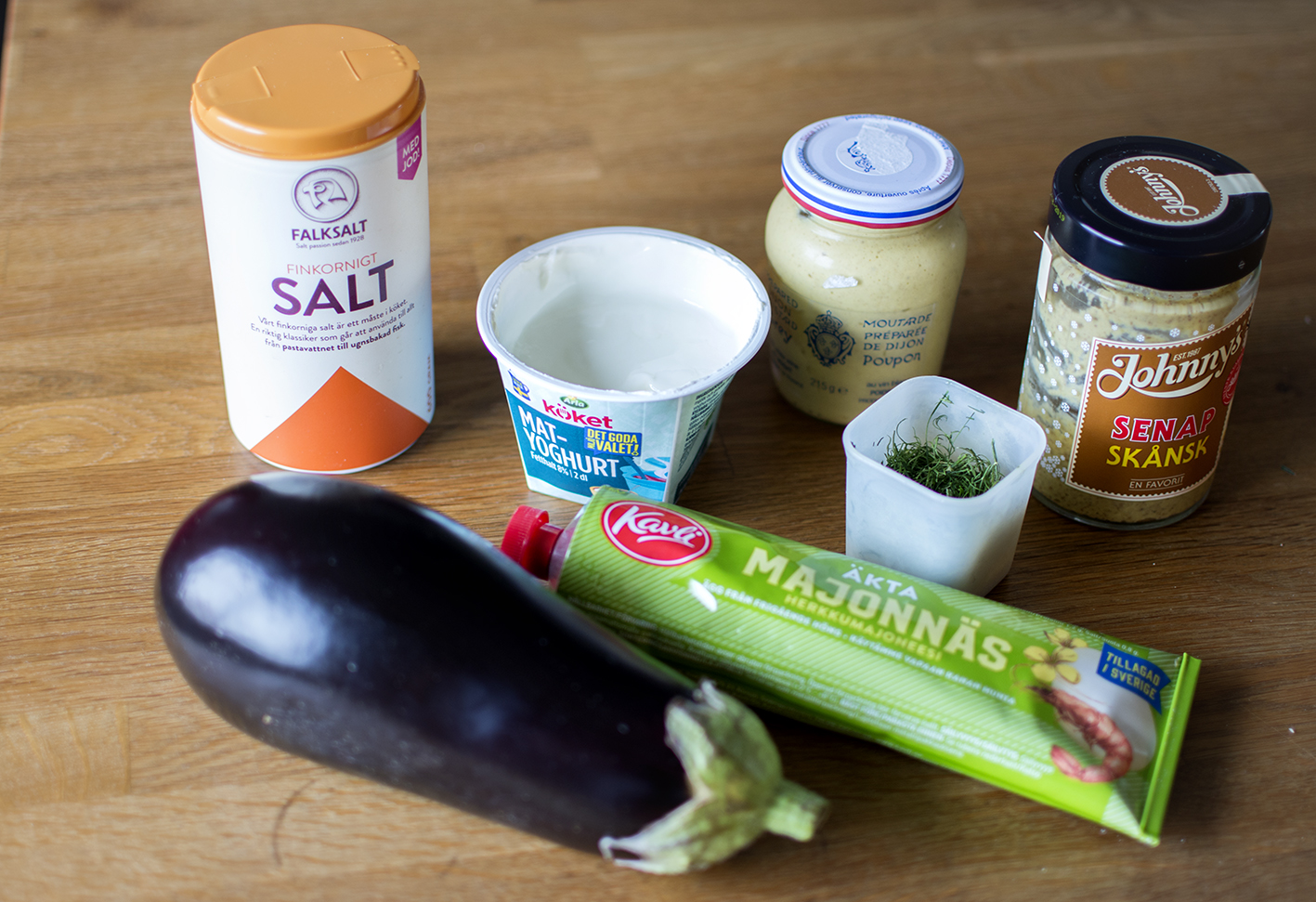 Ännu en vecka med inspiration från Vegomagasinet. Den här gången: aubergineströmming. Rätten lurar visserligen ingen som vill ha fiskvarianten, men låt inte det hejda. Mycket gott! (Jag gjorde som vanligt några avsteg från originalreceptet. Köp tidningen om du vill se hur det egentligen ska vara.)