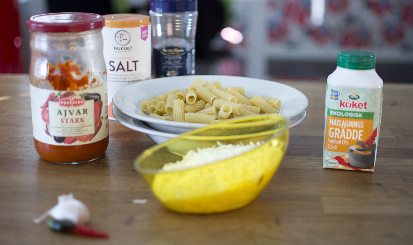 Jag behövde rensa mitt kylskåp på färskvaror och annat som riskerar att förgås i rötmånaden. Har länge sneglat på en öppnad burk med ajvar som hållit sig förvånansvärt fräsch men som nu fick säga bye bye. Den fick sällskap med några få andra ingredienser i en snabblagad pastarätt.