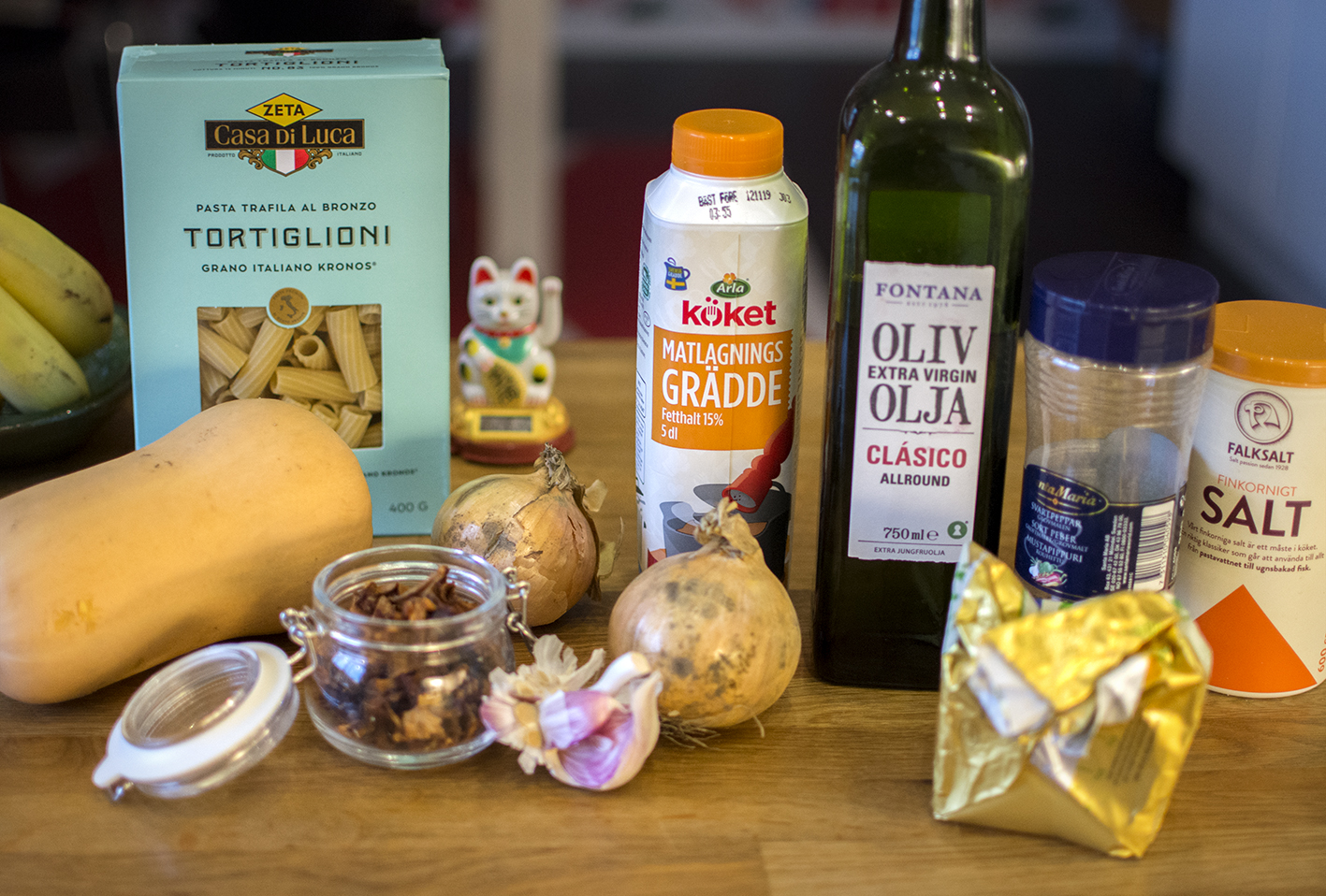 Pumpa och kantareller – kan det bli mer höst? Jag lät mig ännu en gång inspireras av Vegomagasinet, men med min egen twist på rätten. Bland annat testade jag att blötlägga mina torkade kantareller från sommarens skogspromenad. Det blev en fin pastarätt med härliga aromer från den rostade butternutpumpan.