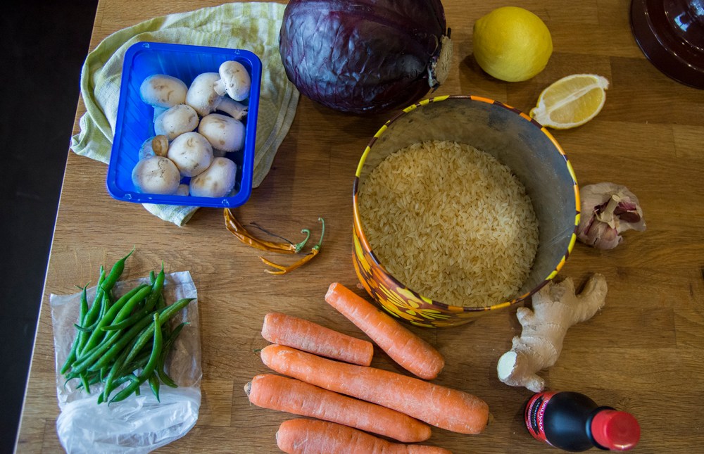 Fräs svampen i oljan tills all vätska kokat in. Tillsätt morötter, vitlök och ingefära. Fräs i ett par minuter. Tillsätt rödkål, chili, gröna bönor, salt och det kokta riset. Blanda allt väl och fräs ytterligare ett par minuter.