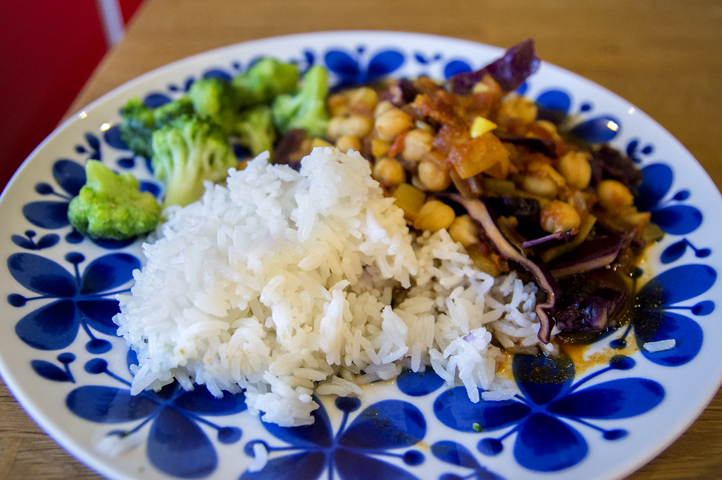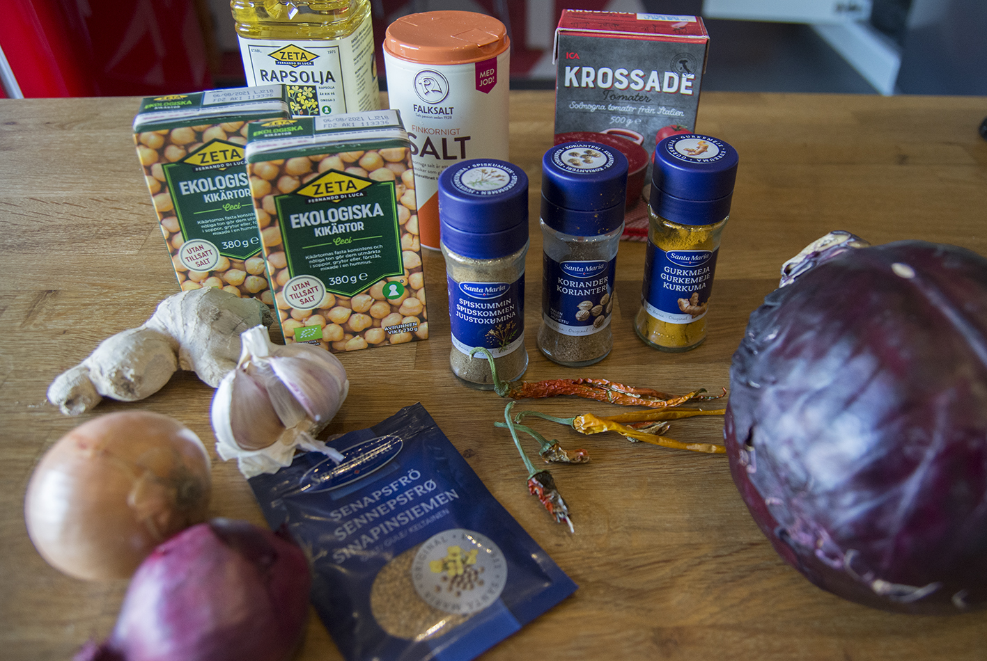 Häll i kikärtor och rödkål. Tillsätt mer vatten om du vill ha en tunnare konsistens. Låt grytan bli varm. Servera med riset och valfri grönsak.