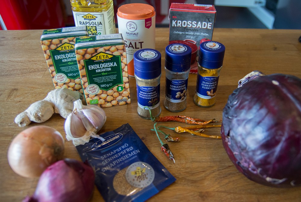 Skala och hacka lök och vitlök. Skala och finstrimla ingefäran. Strimla och skölj rödkålen i durkslag, låt rinna av. Skär chilin i mindre bitar, behåll fröna om du vill ha rejält med hetta släng dem om du vill ha en mildare variant av gryta. Skölj kikärtorna och låt vattnet rinna av.