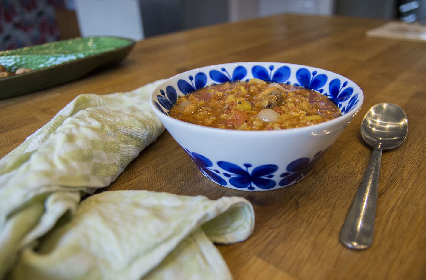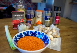 Jag kör på i vinterspåret med ännu en rätt som är värmande, nyttig, billig – och god. Det blev något av en matsvinnsräddare för jag tog lite av varje av det som fanns hemma; en halvpåse röda linser, den där öppnade burken med syltlök som verkar prenumerera på en plats längst bak i kylskåpet, en ledsen purjolöksbit …