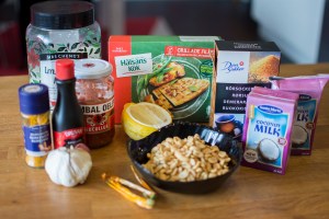 Skär vegoköttet i bitar. Häll kokosmjölk, gurkmeja, sambal oelek, socker och soja i en plastpåse. Pressa i vitlöken. lägg i vegoköttet och blanda runt. Låt marinera i kylskåpet minst en timme, men gärna över natten.