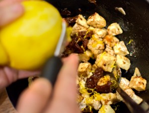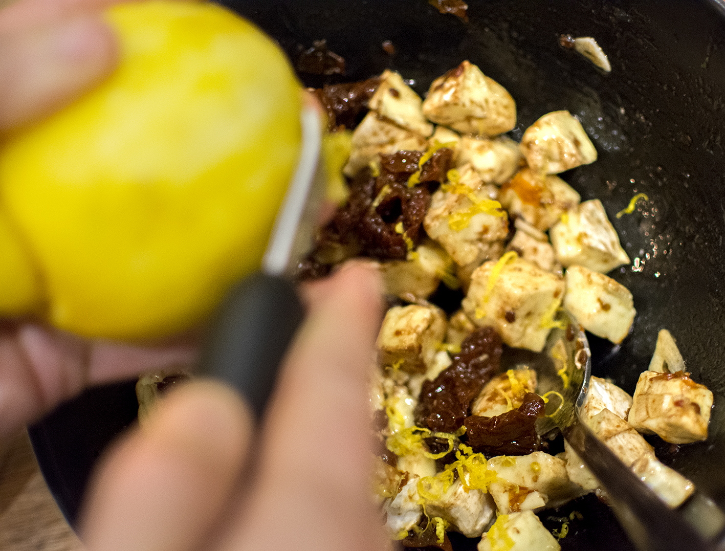 Skär osten i kuber. Lägg de soltorkade tomaterna på hushållspapper och låt oljan sugas in. Skär dem i mindre bitar. Finstrimla vitlöken. Blanda allt i en skål tillsammans med olivolja och balsamvinäger. Riv i citronskal, salta, peppra och smaka av.