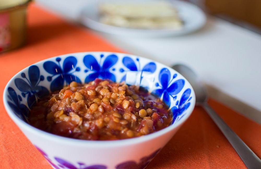 Men. Det var ju inte sant att det inte fanns något. Det är ju rätt sällan sant. Vi har till exempel i stort sett alltid basföda som krossade tomater och linser i skafferiet och inte sällan finns det minst en sorts rotfrukt och lök i kylskåpet. Efter förra årets odlingsbonanza har vi dessutom fortfarande gott om torkad chili.