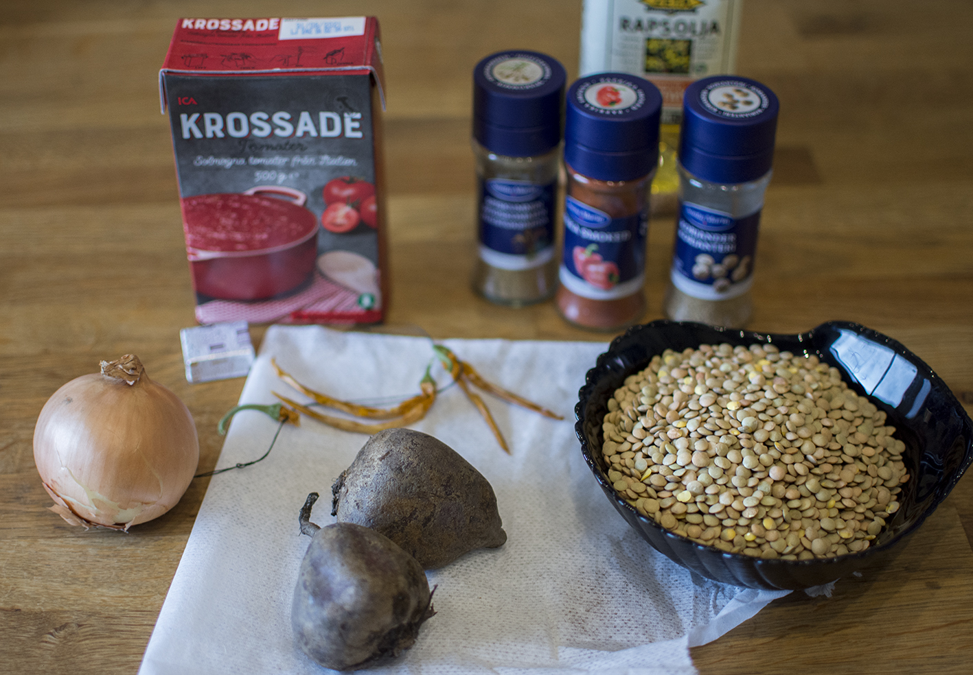 Jag snodde ihop en gryta på gröna linser, tomatkross, rödbeta och ett urval värmande kryddor. Det blev både godare och nyttigare än på IKEA. Och även om deras restaurang är löjligt billig så vinner min rätt även vid en ekonomisk jämförelse. Nu slapp vi köpa på oss en massa ”bra att ha-grejer”.
