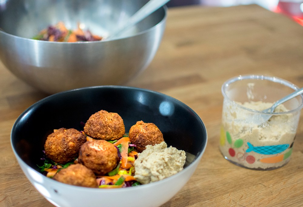 Fördela salladen i fyra djupa skålar. Toppa med falafel och klicka i hummus.
