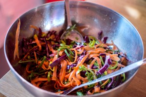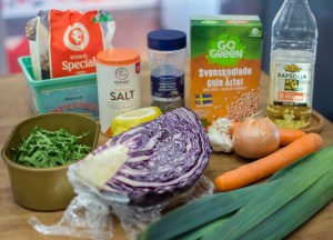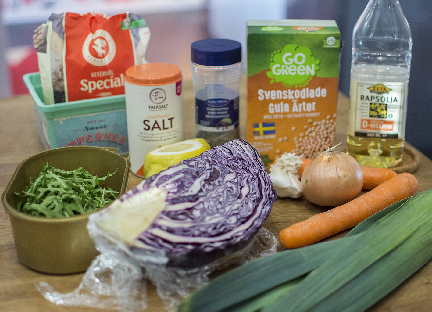 Gör salladen under tiden. Skala morötterna. Skölj och torka rödkål, ruccola och purjo.