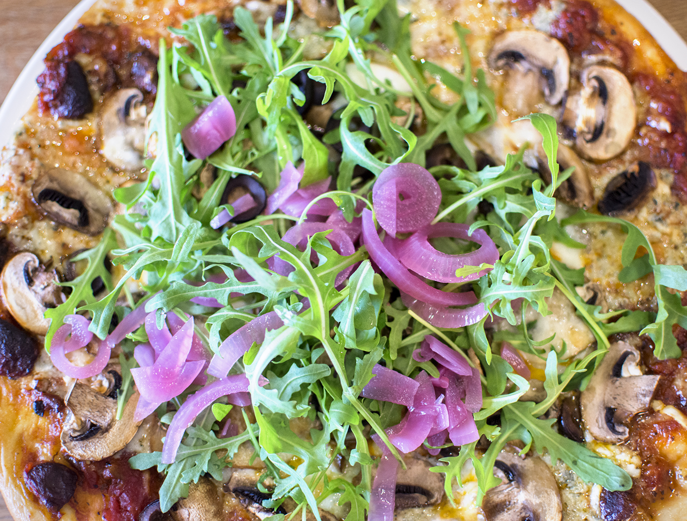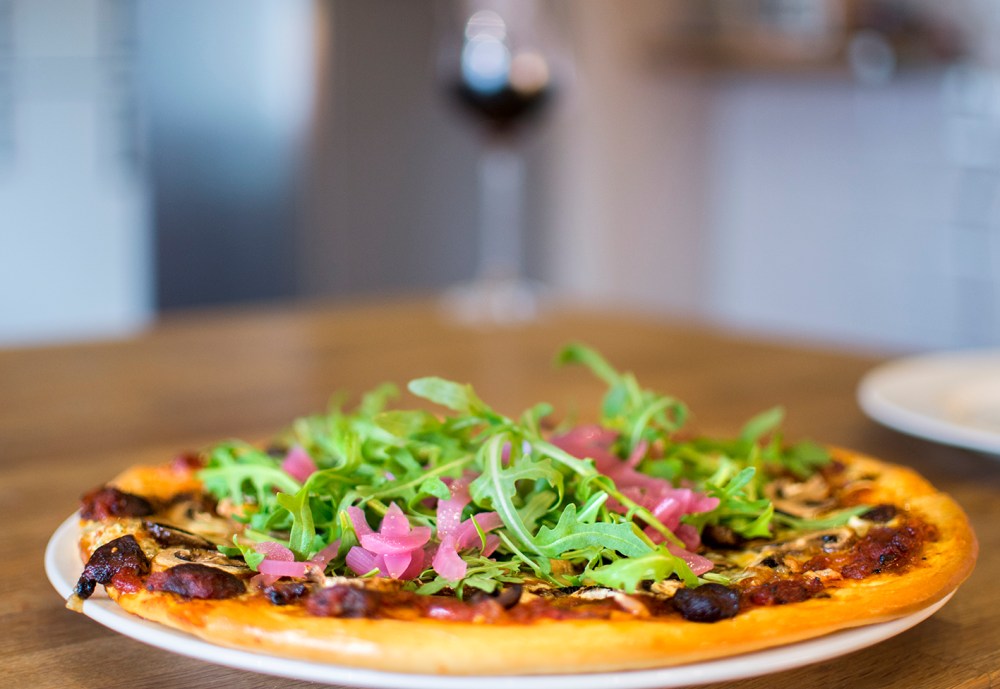 Pensla kanterna med olivolja och toppa pizzan med syrad rödlök och ruccola. Servera med ett glas rödvin. Njut!