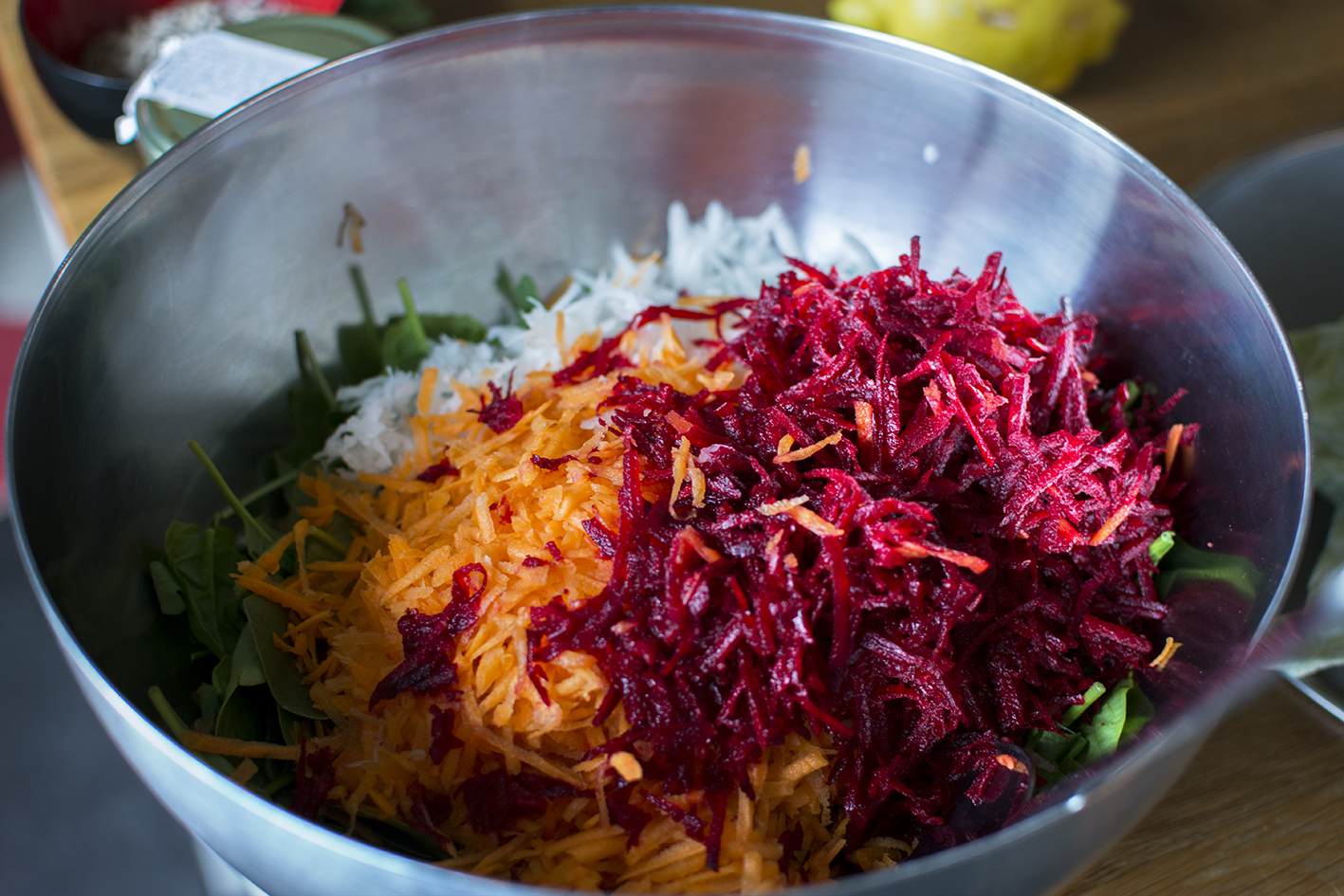 Skala och grovriv rättika, morot och rödbeta. Skölj och skiva purjolöken. Skölj, torka av och skär tomaten i fina bitar. Grovhacka valnötterna. Blanda allt med ruccola, spenat och couscous i en stor salladsskål.