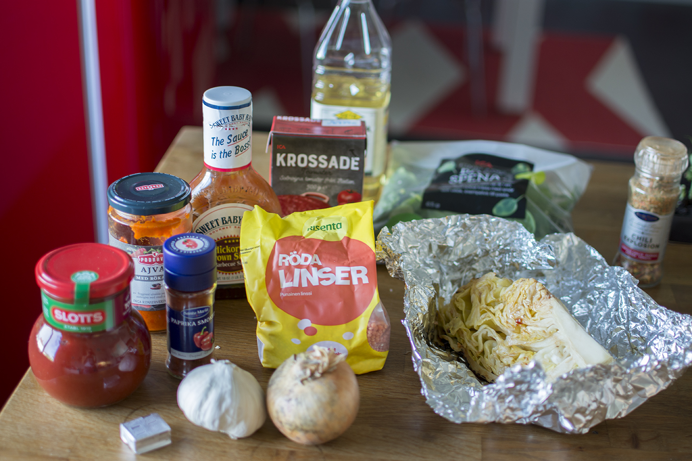 Häll ner de röda linserna, rör om. Tillsätt vatten, buljongtärning, krossade tomater, ajvar relish, barbequesås och chiliflakes. Låt koka upp och småputtra i cirka 15 minuter.