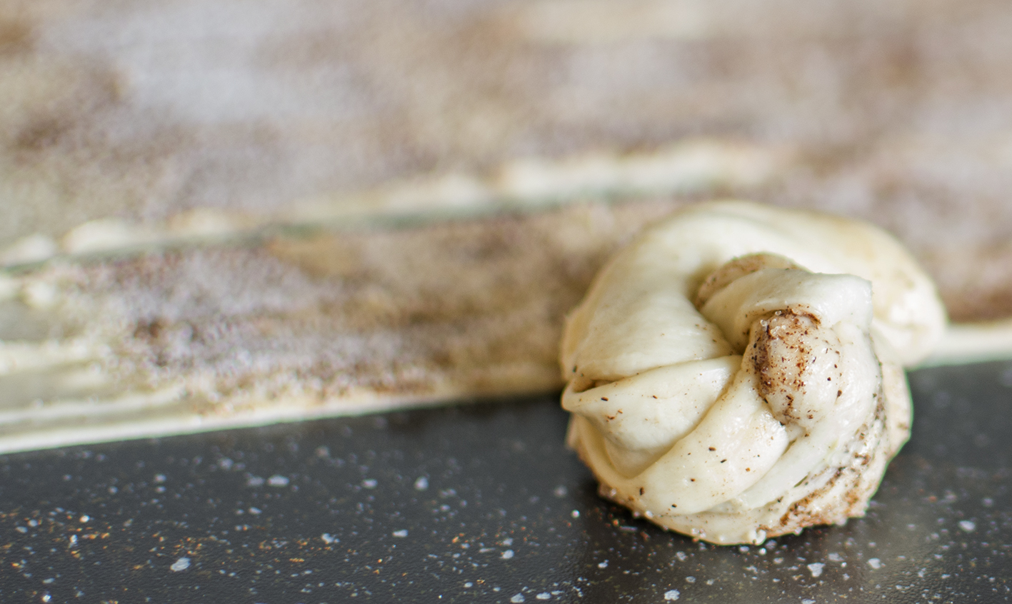 Skär ut tio lika breda remsor av degkakan. Ta tag i ändarna, snurra ihop remsan och gör en knut av den. Det kan inte bli fel – snurra som du vill! Placera bullen i en form. Fortsätt tills du har 40 mer eller mindre snygga bullar. Låt dem jäsa i 30 minuter till.