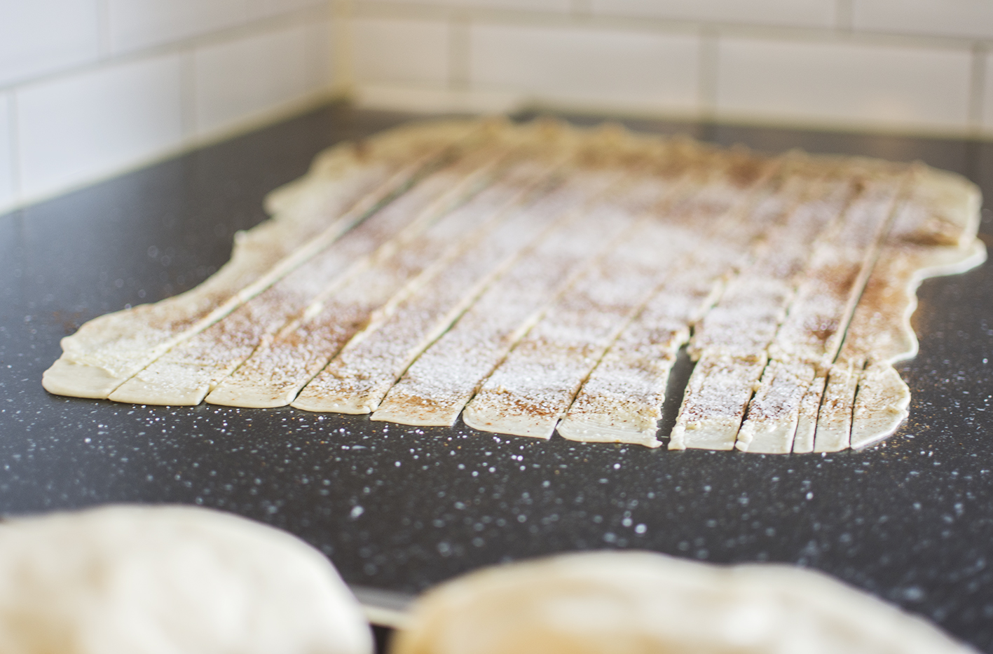 Ta upp den jästa degen på ett lätt mjölat bord, dela den i fyra delar. Knåda och kavla ut varje del till en avlång kaka.
