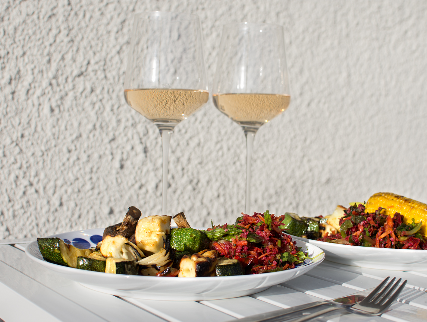 Skölj och putsa squash och spetspaprika. Skala löken. Skär alla grönsaker och halloumin i grova bitar och trä dem på grillspett.
