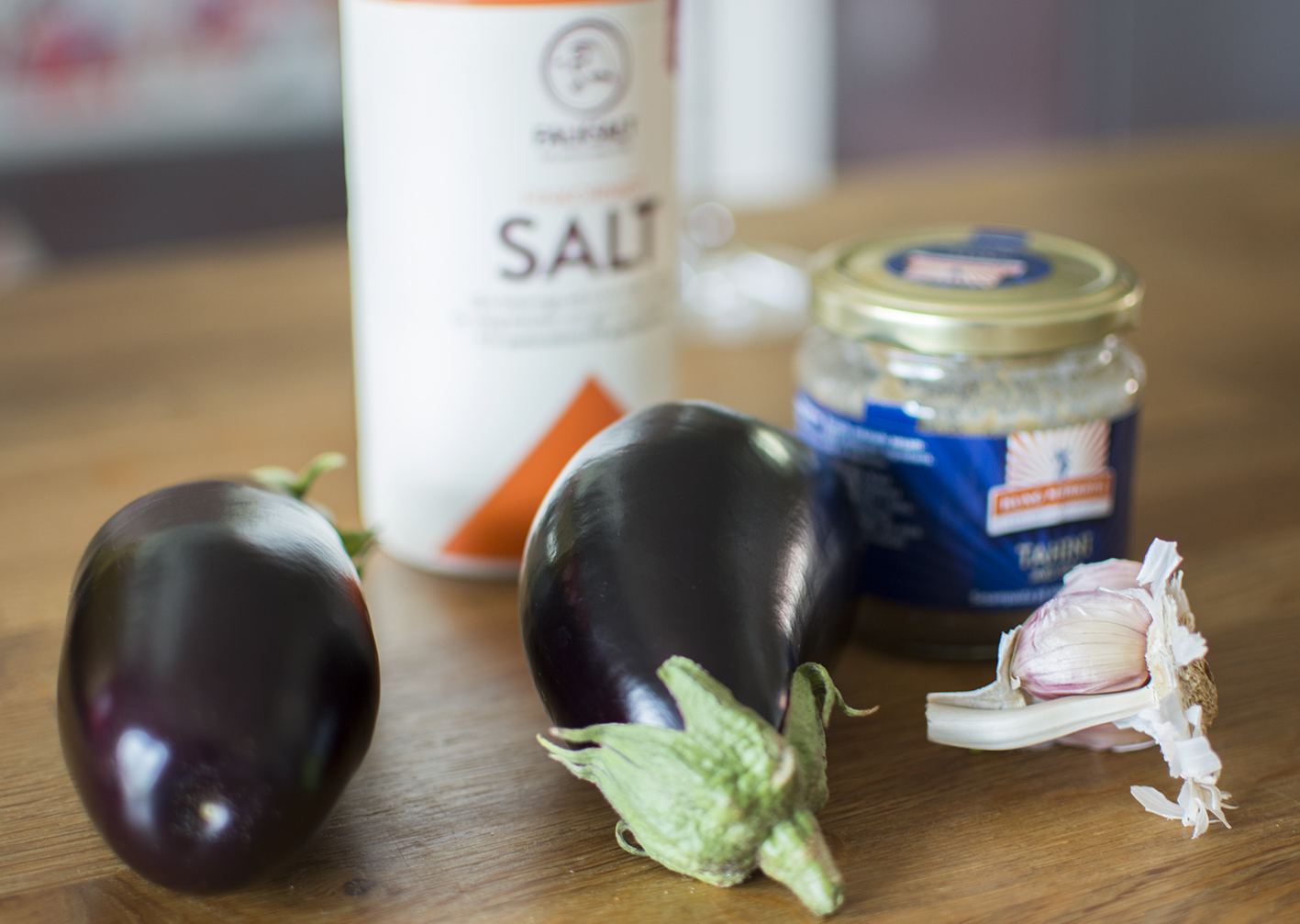 Blanda tahini, salt och citron i skål, pressa i vitlöksklyftan. Vispa tills det blir en fast massa. Blanda i auberginerna och rör om. Smaka av och tillsätt eventuellt mer citron eller salt. Ställ i kylen tills det är dags att servera.