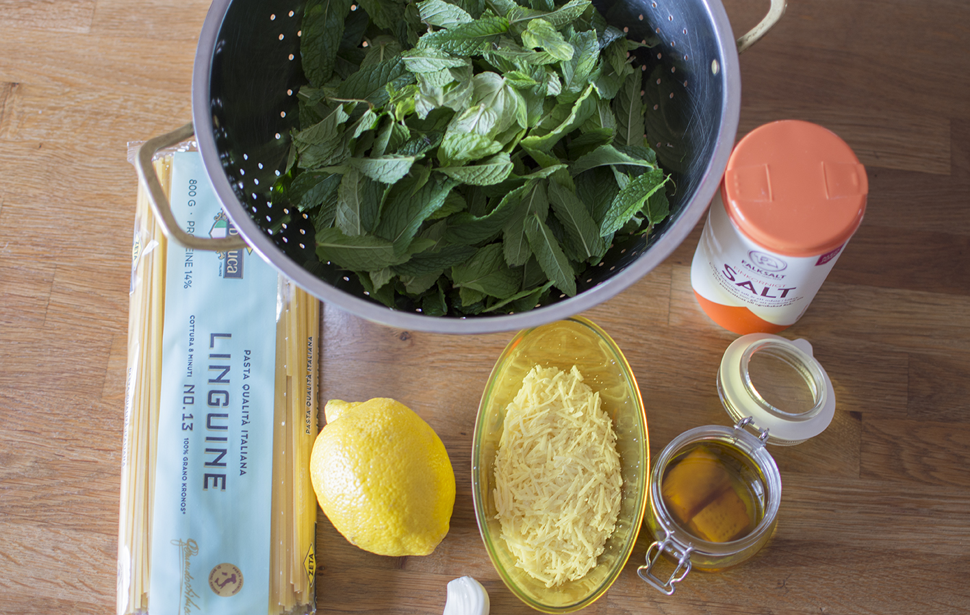 Dagens rätt är en enkel och smakrik pasta. Den är också är ganska klimatsmart, eftersom jag fick användning av både en parmesanolja (parmesanskalkar som legat i olivolja och gottat till sig) och *mynta som växer i någon slags okontrollerad djungel i en pallkrage på baksidan.