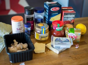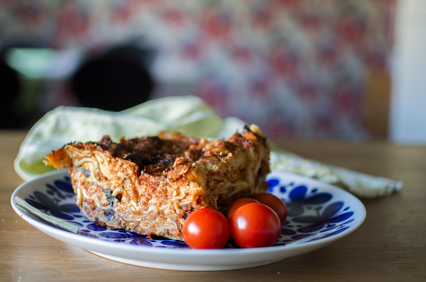 Dags för ännu en variant på lasagne, den här gången med grillost från Dalsland (närproducerat alternativ till halloumi) och en ask champinjoner som ville räddas från kylskåpet.