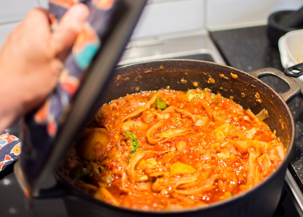 Tillsätt buljongtärning, krossade tomater, sambal oelek, ett kryddmått svartpeppar och 4 deciliter vatten. Låt puttra under lock i 10-15 minuter.