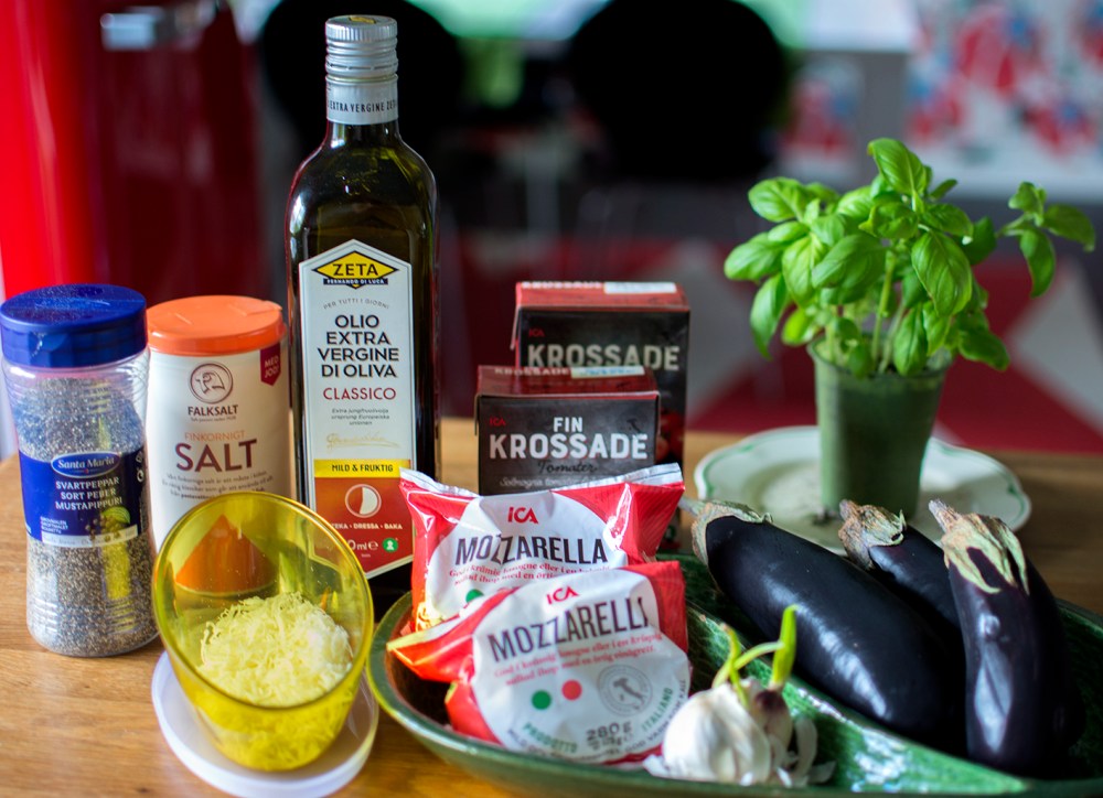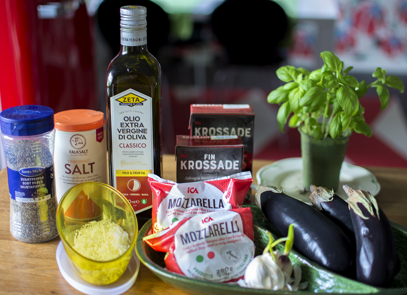 Varva aubergine, tomatsås, mozzarella och det mesta av parmesanosten i en ugnsform. Avsluta med lite sås och toppa med riven parmesan. Gratinera i 15–20 minuter.