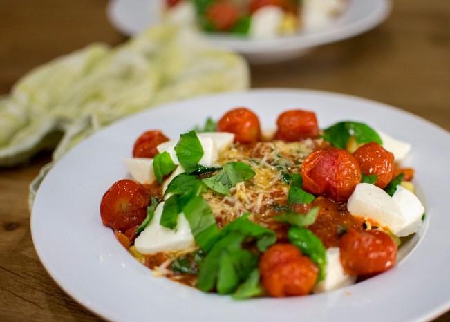 Häll upp pasta i djupa tallrikar. Fördela sås över. Toppa med parmesanost, mozzarella, basilika och ljumna eller kalla konfiterade körsbärstomater.