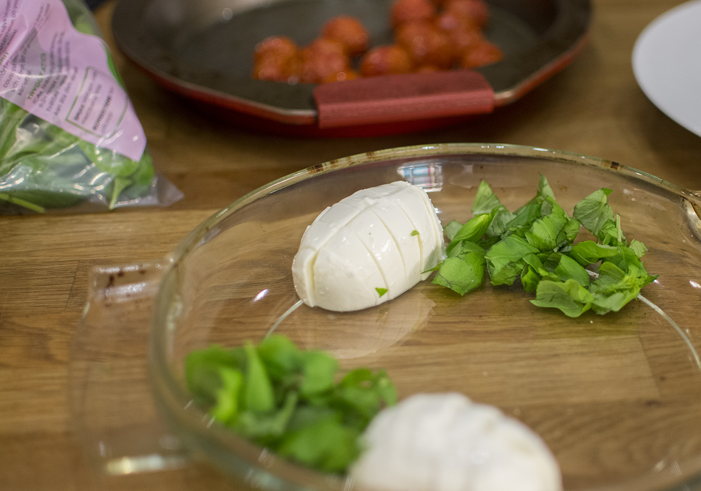 Preppa toppingen: skär mozzarella i mindre bitar och grovhacka basilikablad. Riv parmesanosten.