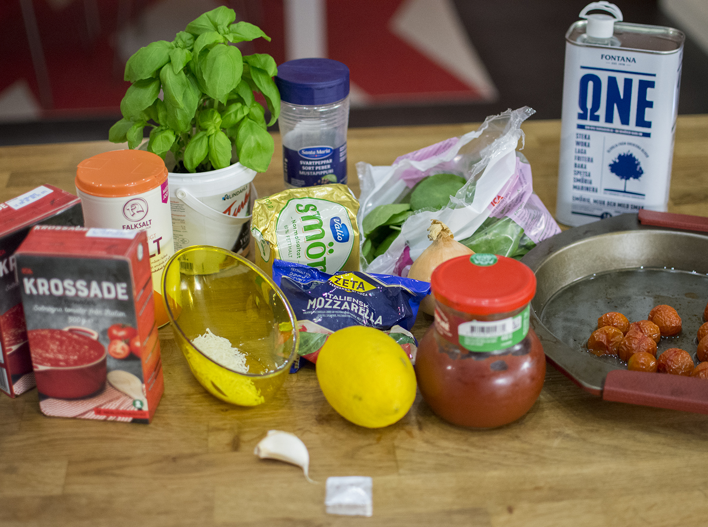 Plocka upp löken från tomatsåsen och riv i skalet från en halv citron. Tillsätt smör. Smaka av och salta och peppra mer vid behov. När du här hundraprocentigt nöjd med smaken: tillsätt den färska spenaten och rör om. Ta såsen från värmen.