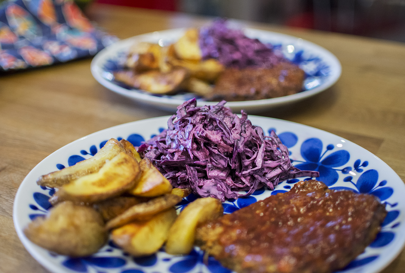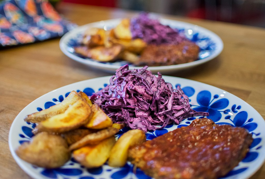 Jag har gjort en ”biff” på Anammas formbara vegofärs enligt ett recept på deras sajt. Latade mig med en färdigköpt barbequesås och gjorde min egen variant av kålsalladen med det amerikaniserade namnet (blir väldigt fin färg med rödkål i stället för vitkål). I övrigt var jag hyfsat trogen instruktionerna. Blev supergott!