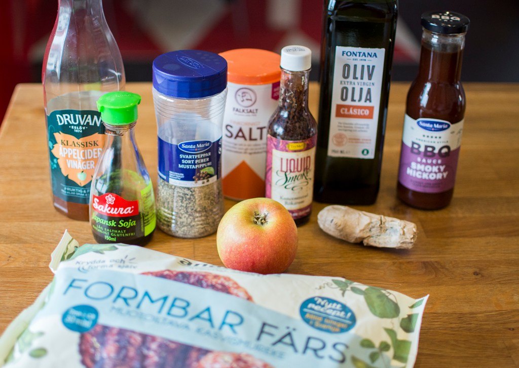 Skala och riv äpple och ingefära. Blanda med vegofärsen och övriga ingredienser. Forma till en stor biff. Baka i ugnen i cirka 20 minuter (om du inte tänt grillen!).
