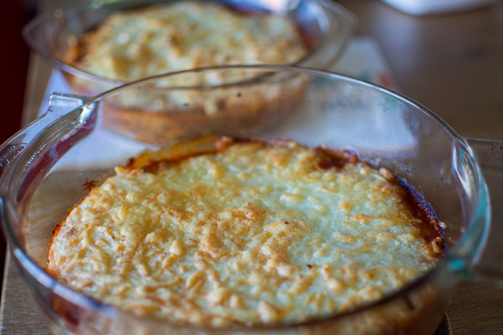 Bred ut såsen i en ugnsfast form. Bred över moset. Sprinkla över lite ost. Baka i ugnen tills moussakan fått fin färg, det tar omkring 20 minuter.
