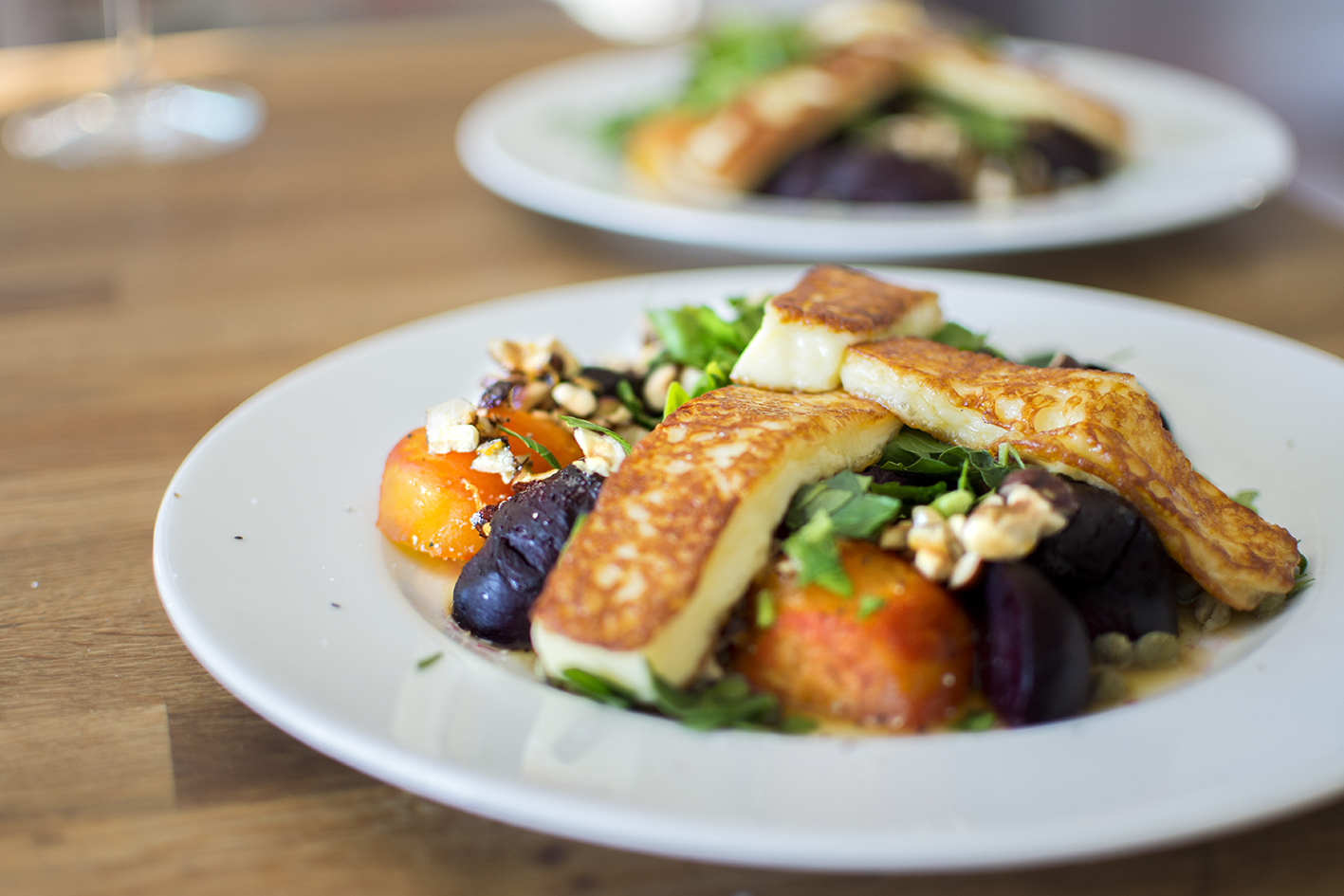 Skala de bakade betorna och placera ut på tallrikar. Strö över kapris. Häll på brynt smör. Salta och peppra. Strö över persiljan. Toppa med grillosten. Servera gärna med ett iskallt glas rosé eller en kall öl.