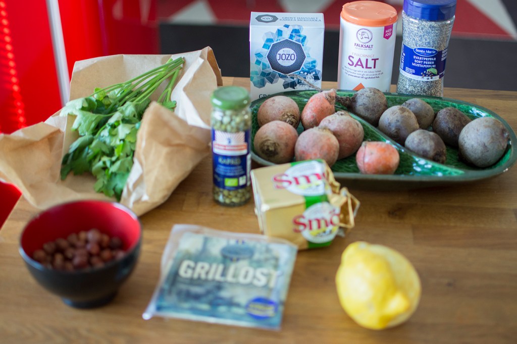 Det har blivit juni och vi har äntligen fått lite friare tyglar när det gäller umgänge. Man MÅSTE ju inte gå på krogen för det! Den här rätten, med saltbakade betor, citron, brynt smör och grillad ost, ger åtminstone mig hemlängtan. En liten fest på tallriken, som funkar som både förrätt och huvudrätt.