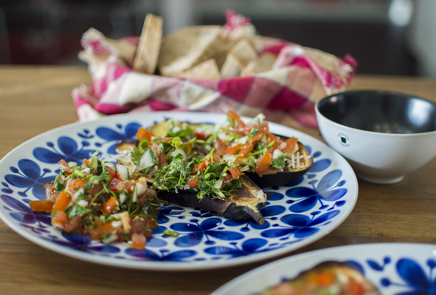 Gör salsan under tiden. Skala och finhacka lök, vitlök, chili och tomater. Blanda allt i en bunke. Grovhacka koriander och dill och blanda ner i salsan. Pressa i citronsaft. Salta, peppra, rör om och smaka av. Låt stå kallt tills auberginerna är klara.