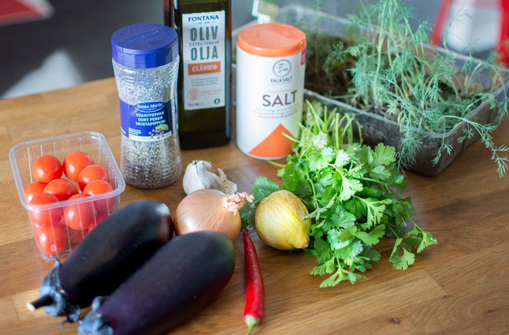 Äntligen börjar växterna i växthuset ge skörd! Än får jag vänta på egen vitlök, tomat och chili, men jag lyckades få ihop tillräckligt med råvaror – aubergine, koriander, dill – för en fräsch och somrig lunch, med lite hjälp från Ica. Därifrån kommer också inspiration till receptet, som jag ändrade en aning.