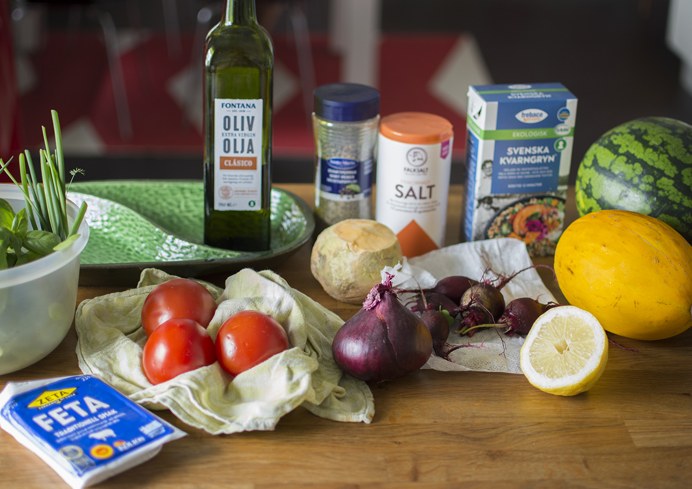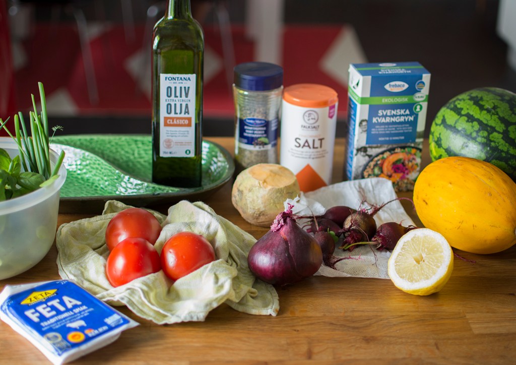 Skölj och skär tomaterna i grova bitar. Skala och finhacka rödlöken. Skala och hyvla kålroten i fina strimlor (hyvla med potatisskalaren). Skala och skär rödbetorna i så tunna skivor som möjligt. Skala och skär melonerna i grova bitar. Skölj och hacka örterna fint, men spara några hela basilikablad till serveringen. Blanda alla grönsakerna och kvarngrynen i en bunke.