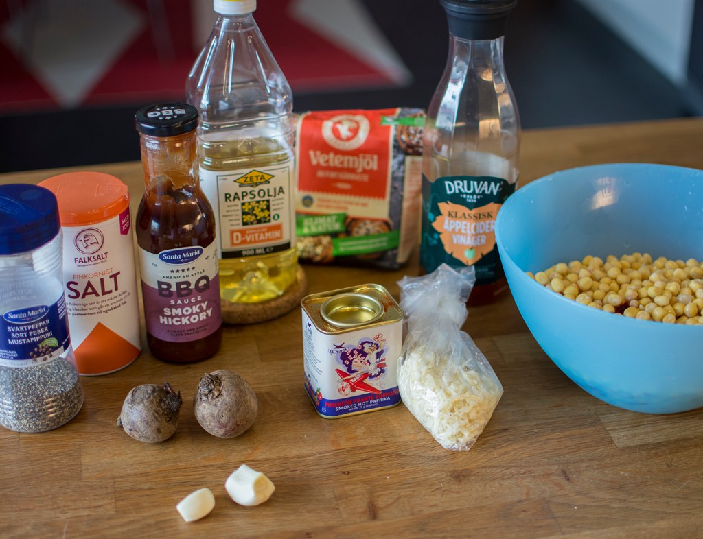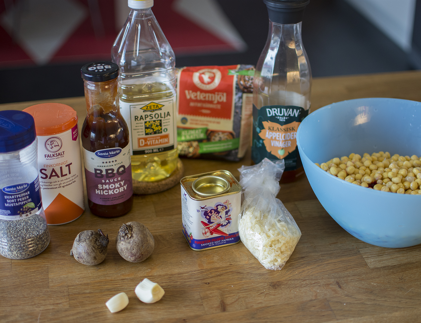 Riv de två rödbetorna till smeten grovt. Skala vitlöken och mixa med ärtorna till en grynig massa i en bunke. Tillsätt paprikapulver, barbequesås, rökessens, riven ost, äppelcidervinäger, 4 matskedar av rapsoljan, mjöl, salt och peppar. Blanda väl.