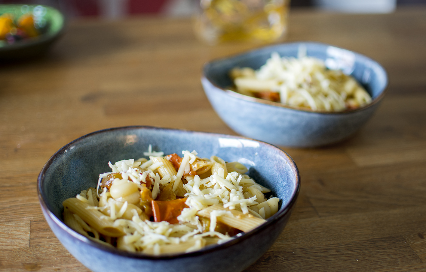 Mosa tomaterna och blanda med pastan. Fördela på tallrikar. Strö på riven ost. Ät. Njut!
