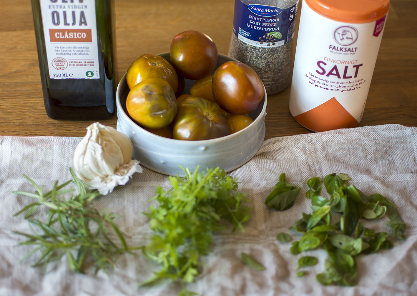 Skölj och torka tomater och örter. Skala vitlöksklyftorna. Placera tomaterna i en liten ugnsform, de ska stå tätt, tätt. Häll över olivoljan och tryck ner örter och de hela vitlöksklyftorna. Salta och peppra. Rör om.