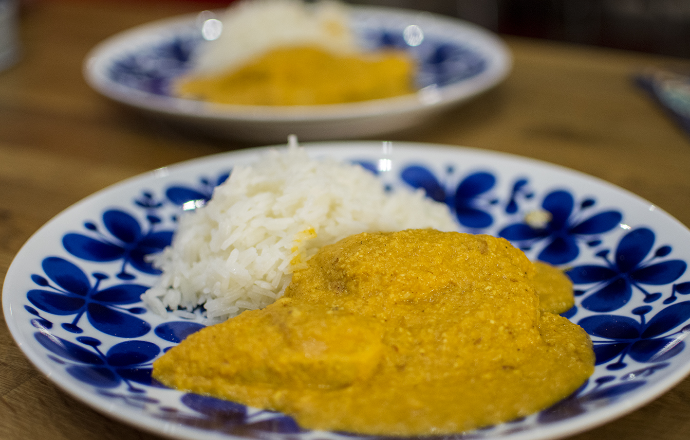 Korma är en indisk sås som för det mesta används för att göra rätter med kyckling eller lamm. Men det går ju precis lika bra med ett vegoalternativ! Jag använde filéer från Quorn vilket liknar kyckling i utseende och konsistens. Skillnaden är väl mest att hönan Agda får sprätta vidare …