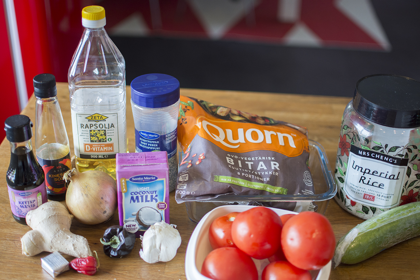 Bryn vitlök, lök och ingefära tills de fått färg. Tillsätt chili, tomater, quornbitar, ketjap manis och soja. Salta och peppra lätt. Rör om och sjud ett par minuter.