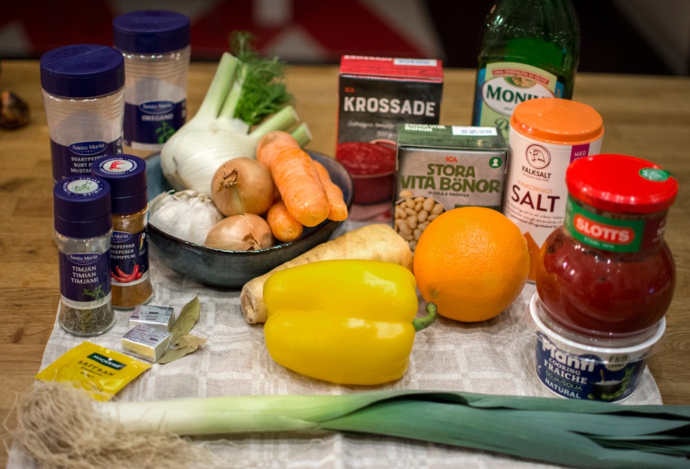 Häll i resterande vita bönor i bouillabaissen. Smaka av med saften från en halv apelsin, salt och svartpeppar.
