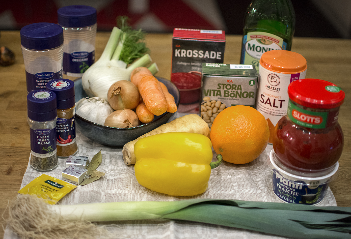 Häll i resterande vita bönor i bouillabaissen. Smaka av med saften från en halv apelsin, salt och svartpeppar.
