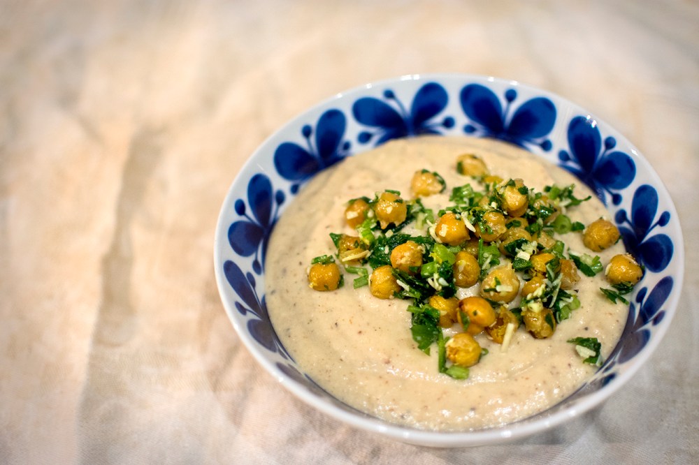 En soppa lika blek som en januaridag – det passar väl bra just nu? Den här är trots sitt modesta yttre fullpackad med smak och får en extra skjuts av supergod gremolata med rostade kikärtor på toppen. (Inspirationen kommer från Zeta.)