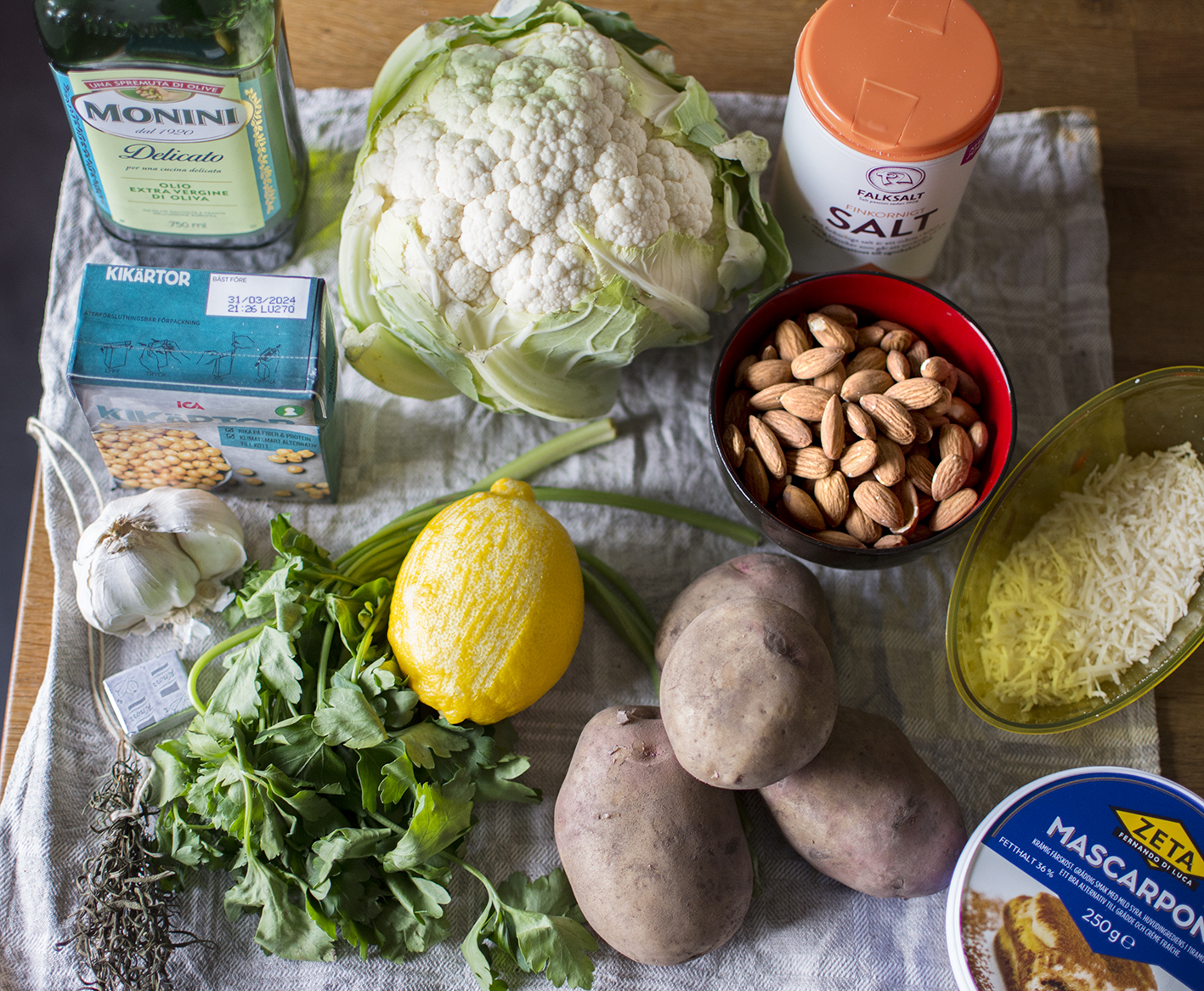 Värm ugnen till 250 grader. Ansa blomkålen, skär bort rotstocken, skölj och skär resten i grova bitar. Skala och skär potatisen i mindre bitar. Skala vitlöken. Lägg allt i en ugnsform och ringla på olivolja. Strö över salt och rosmarin. Rosta mitt i ugnen.