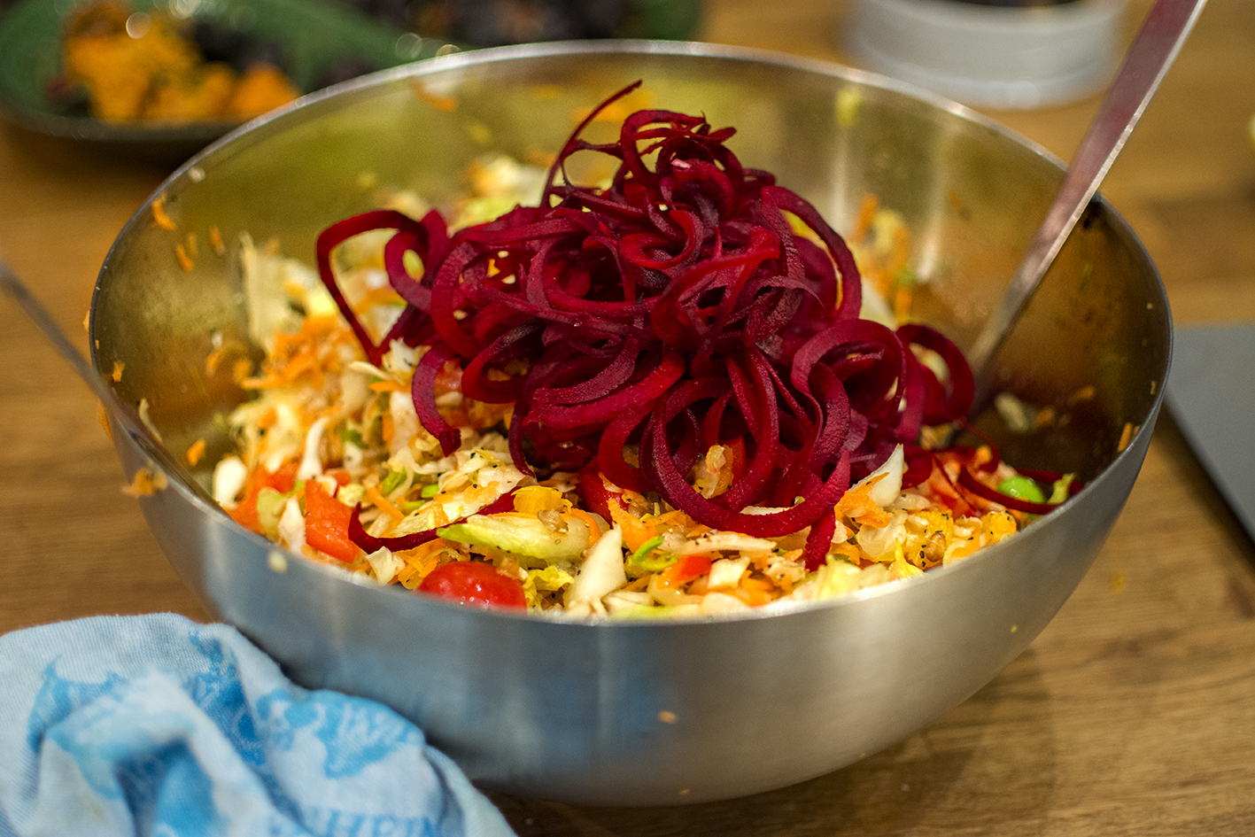 Häll av lagen och blanda ner den kalla vitkålen i salladen. Smaka av en sista gång och krydda mer vid behov.