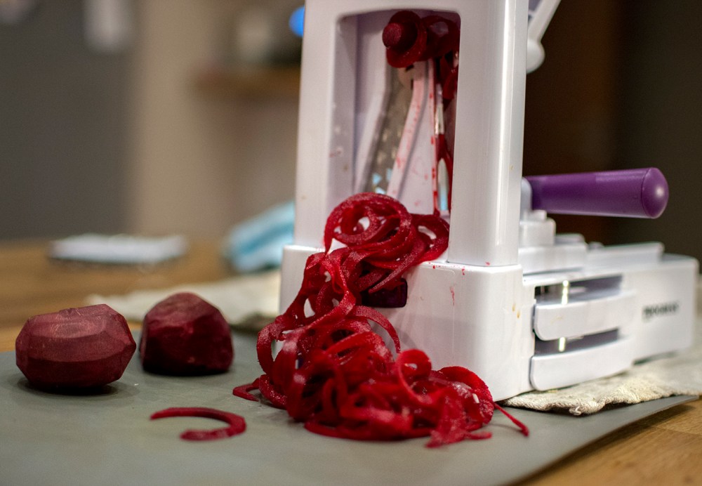 Skala morötter och rödbetor och skär bort rotfästen. Grovriv morötterna och svarva rödbetorna till långa spiraler.